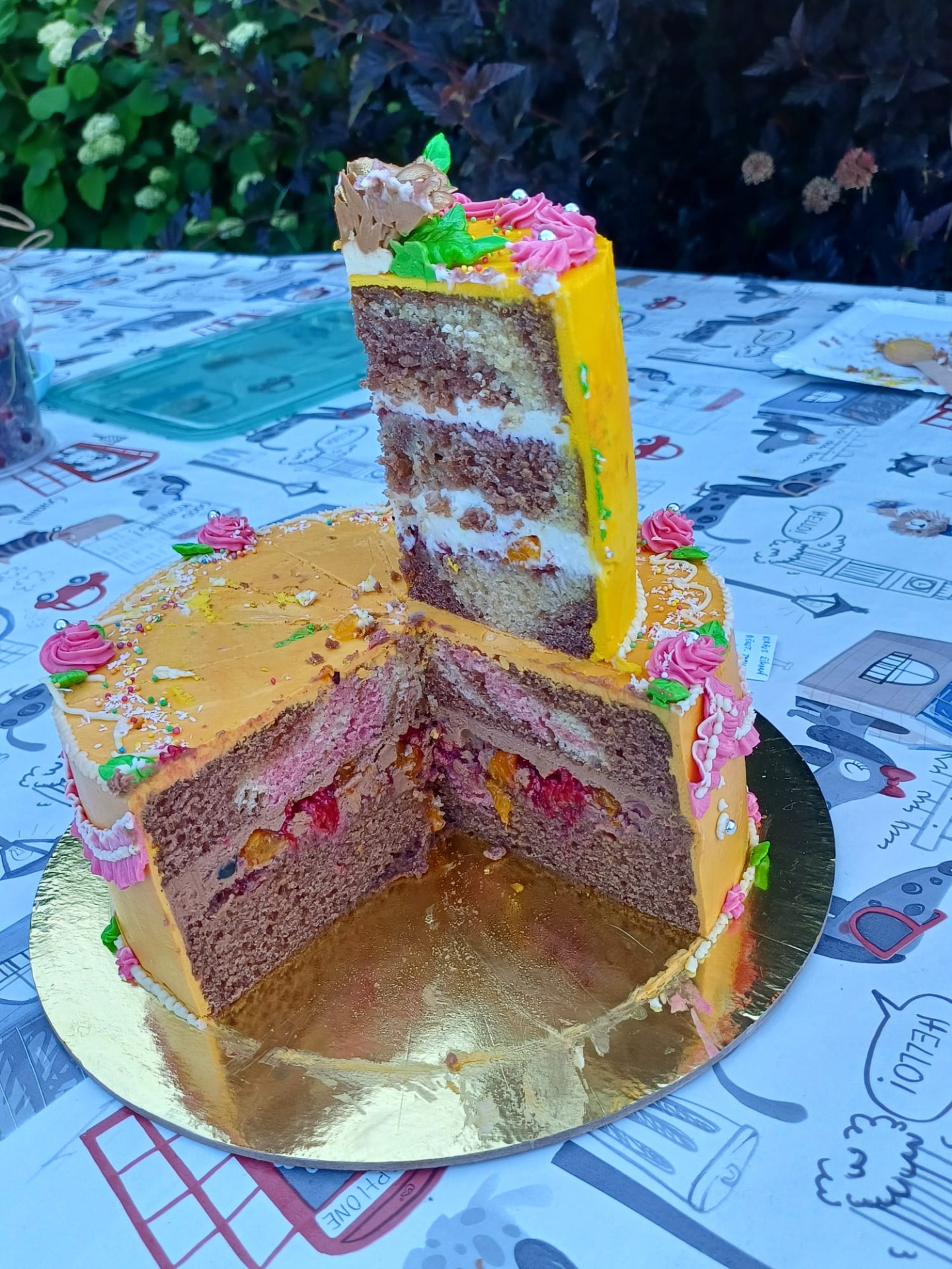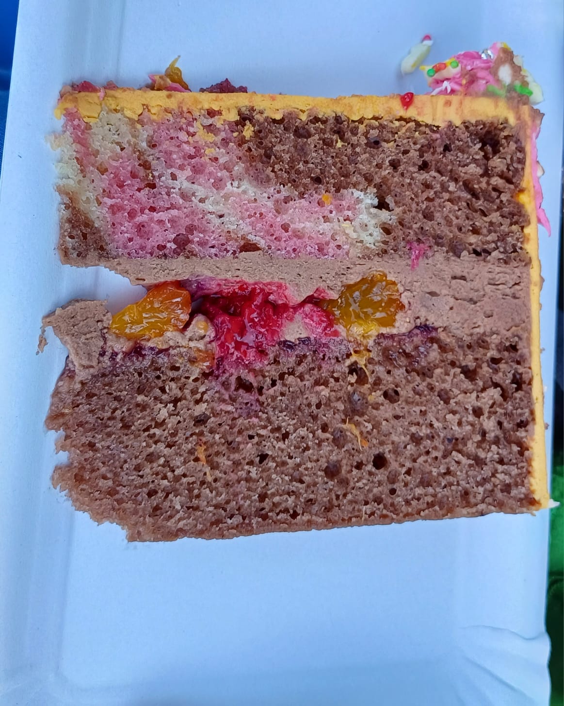 Světlý a tmavý korpus piškotového typu s barevným žíháním a s (horní patro) kokosovým krémem a ovocem + potaženo krémem s kokosovou příchutí, (dolní patro) s čokoládovým krémem s ovocem + potaženo pomerančovým krémem